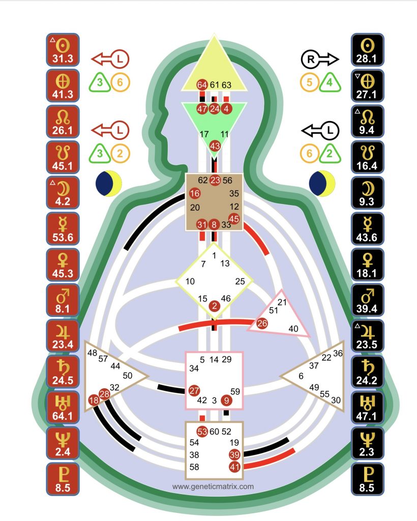 The specific gates in Picasso’s incarnation cross tell an even more detailed story. His conscious sun in Gate 28, line 1, “The Game Player,” speaks to embracing meaningful struggle and demanding from oneself what one demands from others. This is the energy of someone who transforms struggle into achievement, who sees life itself as a great game worth playing with total commitment. Picasso’s relentless self-reinvention, his refusal to rest on his laurels, his constant push against his own boundaries – this is Gate 28 in its highest expression.